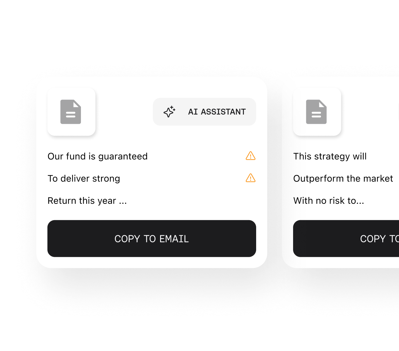 Add compliance checks to any AI agent, copilot, or internal tool with one API. Every piece of content validated against regulations and firm policies before it reaches users.